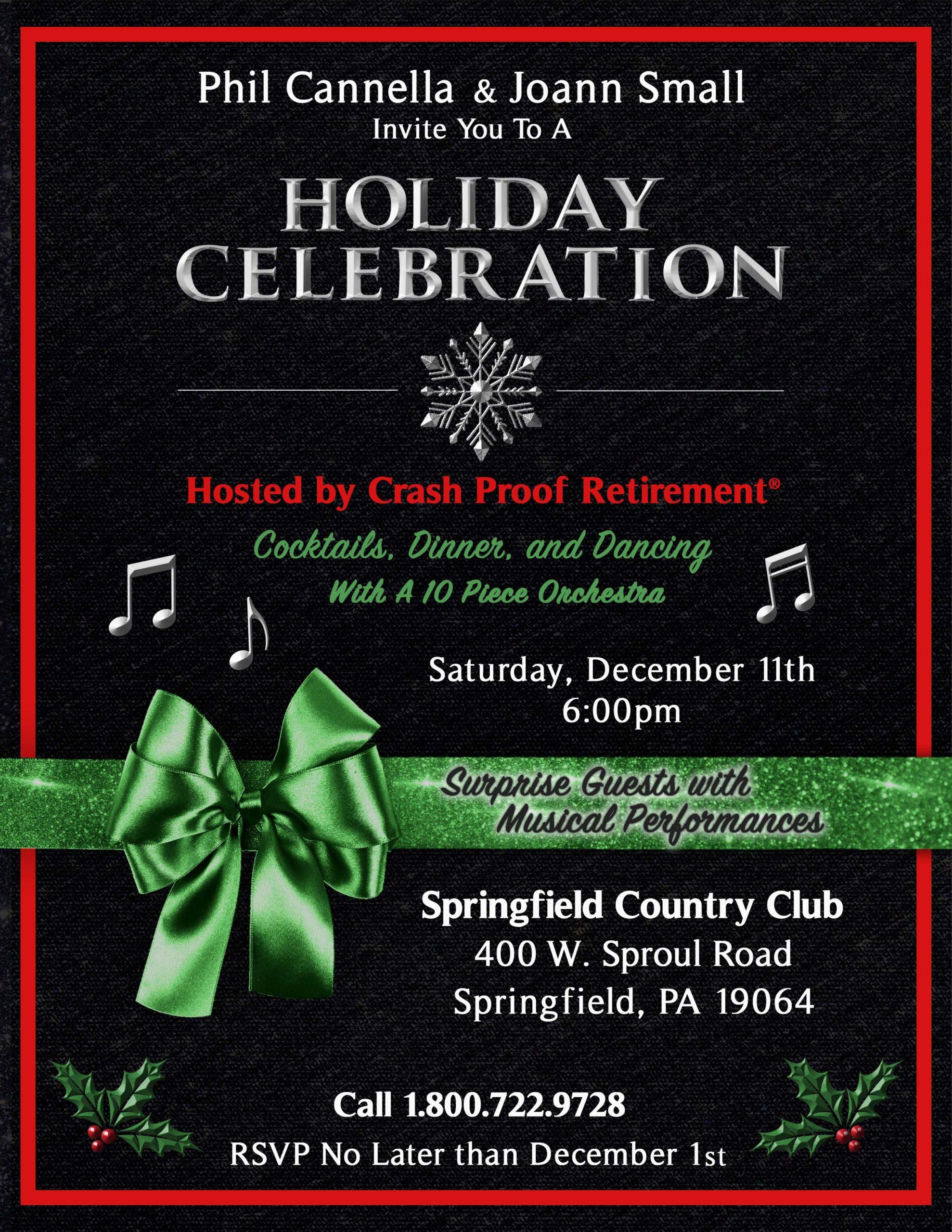 This year’s Holiday Party is now at capacity and a waiting list has been created should spots open up this week. To be placed on the waiting list, please call 1-800-722-9728 to inform our Scheduling Team. The entire Crash Proof Retirement Team wishes you a very happy and safe holiday season and a Happy New Year!
